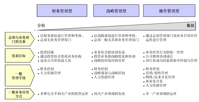 管控模式根據(jù)集分權(quán)程度,一般分為財(cái)務(wù)管控型、戰(zhàn)略管控型和操作管控型,如下圖所示: