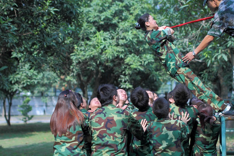 (二)信任背摔。團(tuán)隊(duì)中的每位隊(duì)員站到一個(gè)1.5米的高臺(tái)上,身體筆直向后倒,其他隊(duì)員用手臂去接這名隊(duì)員。訓(xùn)練旨在增強(qiáng)隊(duì)員間的相互信任和理解,同時(shí)克服心理障礙,增加自信心、戰(zhàn)勝恐懼,進(jìn)而增強(qiáng)團(tuán)隊(duì)的凝聚力。