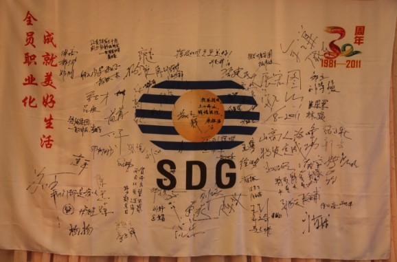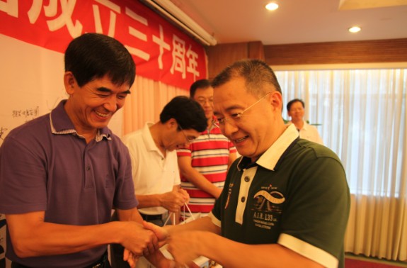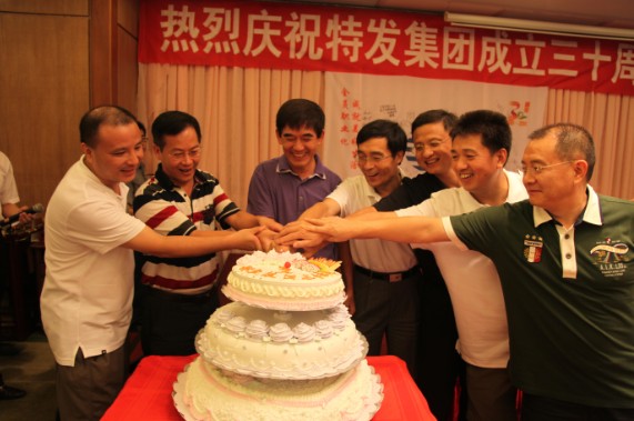 接著,劉愛群董事長發(fā)表了熱情洋溢的祝酒辭。他首先回顧了特發(fā)集團1981年8月1日成立的歷史時刻,叮囑大家記住這個特殊的日子。他說:“我們特發(fā)人用自己的方式來慶祝集團成立三十周年,我們的生日很有特色。從去年開始,我們安排了一系列文化體育活動,用一年的時間來慶祝特發(fā)30歲生日。去年11月,集團在2010年(第四屆)深圳企業(yè)文化節(jié)活動中,以第一的排名獲深圳企業(yè)文化建設十佳單位榮譽稱號;今年5月,集團在2011年(第八屆)廣東省企業(yè)文化建設論壇活動中,以第一的排名獲廣東省企業(yè)文化建設十佳單位榮譽稱號。今年3月,為慶祝特發(fā)集團成立30周年而編著的《生機——一家傳統(tǒng)國企轉(zhuǎn)型密碼》一書,由廣東省出版集團花城出版社出版,新華書店發(fā)行;6月,集團舉辦特發(fā)三十年迎大運羽毛球邀請賽,感謝社會各界30年來對特發(fā)改革發(fā)展的關心和支持”。“今天我們又邀請了公司董事、監(jiān)事,共同慶祝特發(fā)成立三十周年,因為我們是一家人,對特發(fā)有一樣的期望和祝福”。他還歷數(shù)了下午大家在司旗上留下的生日感言,并說:“我寫的祝福語是‘特發(fā)的明天更美好’。我提議大家舉杯,為特發(fā)的明天更美好干杯!”全場響起了歡快的笑聲和掌聲,大家紛紛舉杯、祝福,表達特發(fā)人對事業(yè)的熱愛和對明天的美好期盼。