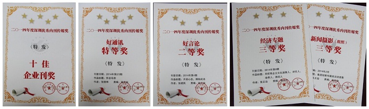 12月15日,在2014年度深圳內(nèi)刊界學(xué)習(xí)交流暨優(yōu)秀內(nèi)刊傳媒獎(jiǎng)?lì)C獎(jiǎng)大會(huì)上,《特發(fā)》月刊和《華僑城》、《寶安風(fēng)》、《華安保險(xiǎn)》、《京基》、《鴻橋》、《深業(yè)》、《城筑》、《勁嘉》、《雅昌》,被市出版業(yè)協(xié)會(huì)、深圳晚報(bào)社授予深圳市“十佳”企業(yè)刊稱號(hào),這是《特發(fā)》月刊連續(xù)六年獲“深圳優(yōu)秀內(nèi)刊傳媒獎(jiǎng)”最高榮譽(yù)。同時(shí),集團(tuán)張俊林董事長的《懷念母親》獲“好通訊”特等獎(jiǎng);張建民總經(jīng)理的《開放心態(tài),擁抱成功》獲“好言論”二等獎(jiǎng);張正治的《用優(yōu)秀企業(yè)文化凝聚人、評(píng)任人、培養(yǎng)人、激勵(lì)人》獲“經(jīng)濟(jì)論壇”三等獎(jiǎng),《集團(tuán)迎新年聯(lián)歡活動(dòng)剪影》獲“新聞攝影(組照)”三等獎(jiǎng)。