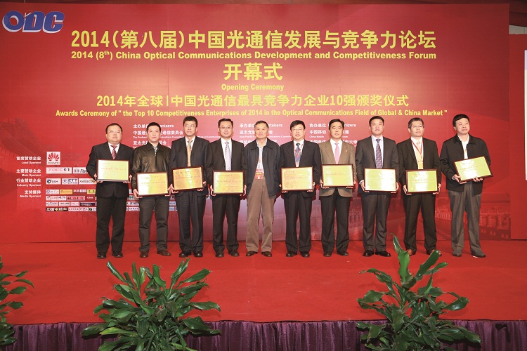 近日,第八屆中國光通信發(fā)展與競爭力論壇暨2014中國/全球光通信最具競爭力企業(yè)10強評選活動頒獎典禮(ODC)在北京舉行。工信部科技委常務(wù)副主任韋樂平、北京郵電大學(xué)原校長林金桐、中國通信學(xué)會、光通信委員會相關(guān)人員及國內(nèi)外知名廠商200余人出席會議。