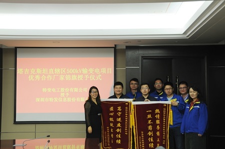 為表達對特發(fā)信息優(yōu)質(zhì)產(chǎn)品和高效服務的感謝之情,承建商特變電工將兩面寫著“匠心極致出精品,篤守進度創(chuàng)佳績”和“一絲不茍創(chuàng)佳績,熱情服務保工期”的錦旗授予特發(fā)信息和公司工程人員。