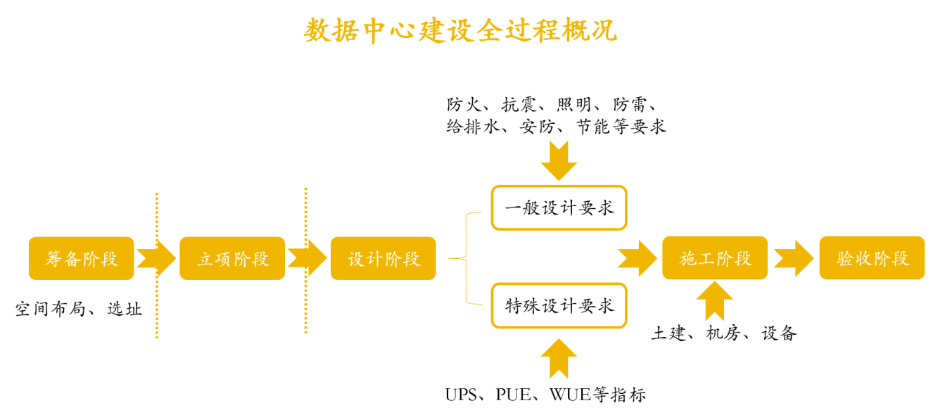 數(shù)據中心在本質上屬于建筑物的一種形態(tài),因此從建設流程上而言,與普通的地產項目比較接近(見下圖所示),按照階段都可以劃分為:籌備—立項—設計—施工—驗收。