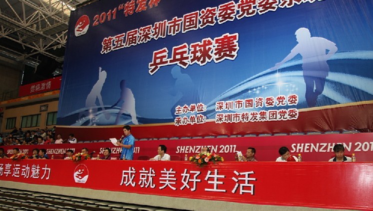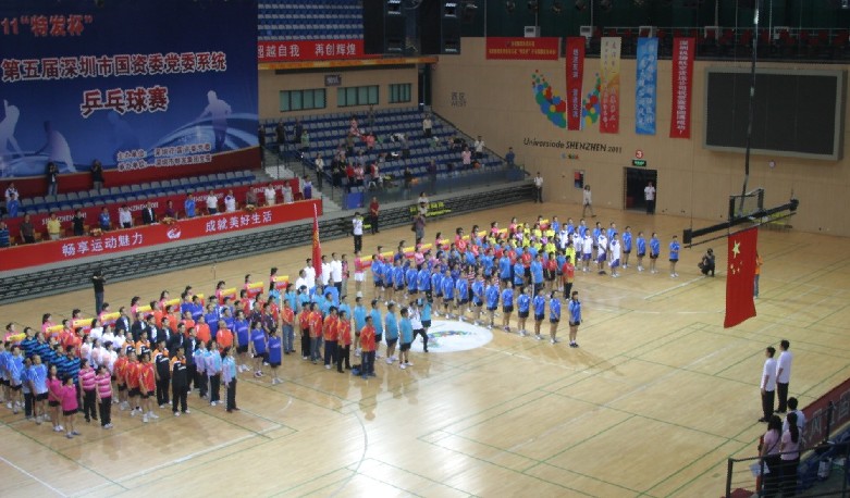 開幕式于10月29日上午8:30舉行。市國(guó)資委黨委書記柏立新,特發(fā)集團(tuán)黨委書記、董事長(zhǎng)劉愛群、黨委副書記、總經(jīng)理施長(zhǎng)躍,國(guó)資委黨辦主任李明、副主任張曉中、唐明通,以及國(guó)資委系統(tǒng)企業(yè)的領(lǐng)導(dǎo)出席開幕式。開幕式由集團(tuán)總經(jīng)理施長(zhǎng)躍主持。此時(shí)的羅湖體育館一派歡快、濃烈的氛圍:主席臺(tái)正面高樹印有本次比賽徽標(biāo)和“2011‘特發(fā)杯’第五屆深圳市國(guó)資委黨委系統(tǒng)乒乓球賽”字樣的巨幅背景板,四周掛滿國(guó)資委和系統(tǒng)各企業(yè)的旗幟與祝比賽圓滿成功的條幅,以及“暢享運(yùn)動(dòng)魅力,成就美好生活”、“樹競(jìng)技風(fēng)尚,展國(guó)企風(fēng)采”等標(biāo)語(yǔ),各單位啦啦隊(duì)和觀眾坐滿看臺(tái)。伴隨著熱烈歡快的運(yùn)動(dòng)員進(jìn)行曲,來(lái)自國(guó)資委系統(tǒng)21家單位的22支代表隊(duì),在美麗端莊的引導(dǎo)員帶領(lǐng)下,隨著高舉國(guó)資委旗幟的旗手、護(hù)旗手依次入場(chǎng),隊(duì)員們意氣風(fēng)發(fā),精神飽滿,步伐矯健,隊(duì)列整齊。在全體起立奏唱國(guó)歌、莊嚴(yán)的升國(guó)旗儀式后,集團(tuán)董事長(zhǎng)劉愛群和國(guó)資委黨委書記柏立新分別代表承辦方和組委會(huì)先后致辭。