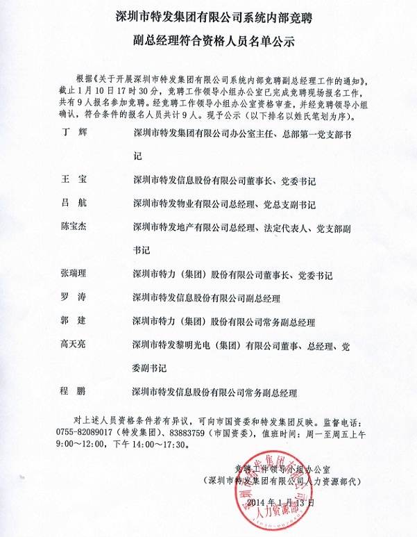 深圳市特發(fā)集團有限公司系統(tǒng)內部競聘副總經理符合資格人員名單公示